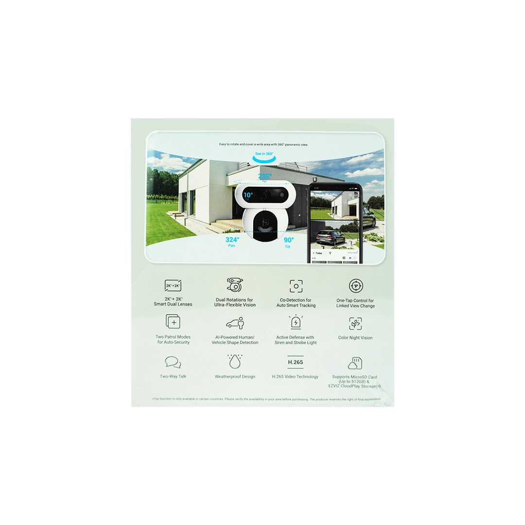 The EZVIZ CS-H90 Dual is an advanced dual-lens Wi-Fi dome IP camera designed for high-level indoor and outdoor security monitoring. With two powerful 4MP sensors delivering ultra-clear 2K+ resolution, it provides enhanced depth perception and wider coverage for comprehensive surveillance.